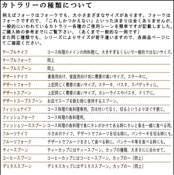 ●業務用以外でも、使用頻度の高い小さめのスプーンやパスタ用 のフォーク、カレーライス用のスプーンなどなど、一般のご家庭 でも おすすめのです。
