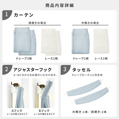 ポール通し可機能: ドレープ:3級遮光・ウォッシャブル ランパス(unr_0038):昼夜透けにくいプライバシーレース・遮熱・UVカット率95.1%・保温・防炎・アレルGプラス・ウォッシャブル 付属品: ドレープカーテン:共布タッセル・アジャスターフックA or B レースカーテン:アジャスターフックA or B 素材: ポリエステル100% 対応スタイル: DX 1.5倍ヒダ(2つ山) ⇒スタイルについて詳しくはこちら ※ご注文サイズによって巾継ぎが発生します⇒詳しくはこちら 色について: 各種コーディネート例の写真はイメージを重視しているため、部屋の照明によっては実際の色と異なって見える場合があります。