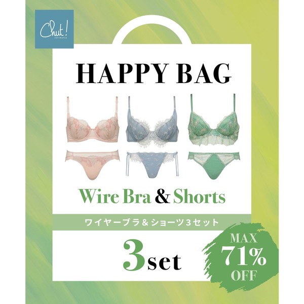 HAPPY BAG Chut!INTIMATESの人気シリーズをふくむ\ワイヤーブラ&おそろいショーツ3SET/をご用意いたしました!Chut!のブラジャーを試してみたい方、最近ブラのサイズが変わった方、まとめて下着を新調したい方にもピッタリ!中身は最大26,840円(税込)相当!MAX71%OFFと大変お買い得 !数量限定につき、売り切れ次第販売終了とさせていただきます。