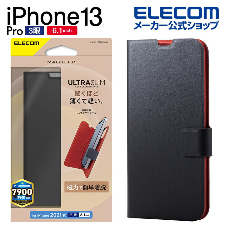 エレコム iPhone 13 Pro 6.1inch 3眼 用 ソフトレザー 着脱レザーフラップ 薄型 MAGKEEP 2021 アイフォン iphone13 6.1インチ 3眼 ソフトレザーフラップ ケース カバー 着脱可能 ブラック PM-A21CPLFUMBK