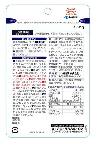 小林製薬 栄養機能食品 「マカ・亜鉛 PREMIUM いつまでも活力ある生活を送りたい男性に <マカ・亜鉛の特長> ○いつまでも活力ある生活を送りたい男性に ○着色料、香料、保存料すべて無添加 <信頼への全成分表示(製造時、1日目安量あたりの含有量)> マカエキス 130.0mg 結晶セルロース 310.4mg 亜鉛酵母(亜鉛10.0mg配合) 200.0mg デキストリン 86.7mg エゾウコギエキス 12.0mg 食用油脂 66.0mg 高麗人参エキス 4.0mg 微粒酸化ケイ素 13.3mg L-アルギニン 100.0mg グルコース 12.0mg L-シトルリン 100.0mg ステアリン酸カルシウム 10.0mg L-シトルリン 100.0mg マルトデキストリン 5.6mg <マカ・亜鉛プレミアムの原材料名> 亜鉛酵母、マカエキス、L-シトルリン、デキストリン、食用油脂、エゾウコギエキス、グルコース、マルトデキストリン、高麗人参エキス/結晶セルロース、L-アルギニン、微粒酸化ケイ素、ステアリン酸カルシウム <栄養成分表示<1日目安量(3粒)あたり> エネルギー 4.3kcal 食塩相当量 0.00042〜0.017g たんぱく質 0.46g カルシウム 0.17〜1.7mg 脂 質 0.084g 亜 鉛 10.0mg 炭水化物 0.42g アルギニン 100mg シトルリン 100mg <マカ・亜鉛プレミアムのお召し上がり方>栄養補助食品として1日3粒を目安に、かまずに水またはお湯とともにお召し上がりください。
