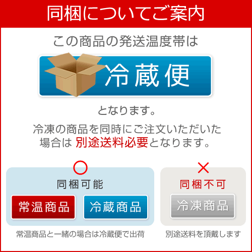 ※こちらの商品 + 常温の商品 = 同梱OK ※こちらの商品 + 冷蔵の商品 = 同梱OK ※こちらの商品 + 冷凍商品 = 同梱不可、冷凍便の送料別途必要 ■常温・冷蔵商品、冷凍商品・産地直送商品混合でのお買い物の場合、商品代金が 21,600円を超えるごとに 1個口分送料サービス致します。