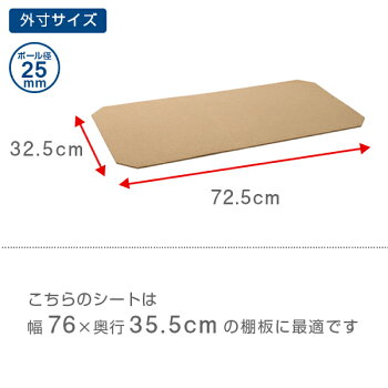 ・ポール径25mm用シェルフ(棚) 棚幅76cm、棚奥行35.5cm適応サイズ・ポール径19mm用シェルフ(棚) 棚幅74.5cm、棚奥行34.5cm適応サイズ(※ポール径19mm用シェルフ適応サイズのため、ポール径25mm用シェルフに使用する場合は、棚面よりも一回り小さくなります。