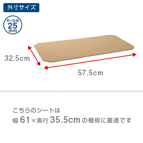 ・ポール径25mm用シェルフ(棚) 棚幅61cm、棚奥行35.5cm適応サイズ・ポール径19mm用シェルフ(棚) 棚幅59.5cm、棚奥行34.5cm適応サイズ(※ポール径19mm用シェルフ適応サイズのため、ポール径25mm用シェルフに使用する場合は、棚面よりも一回り小さくなります。