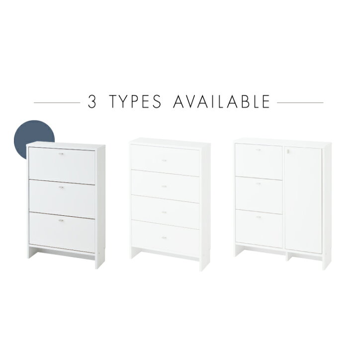 上から中身が見えて整理がしやすいフラップタイプ、小物や洗面用具などの収納に便利な引き出しタイプ、収納物の高さに合わせて高さを調節できる棚板付きの扉収納付きタイプ。